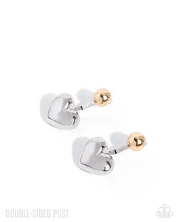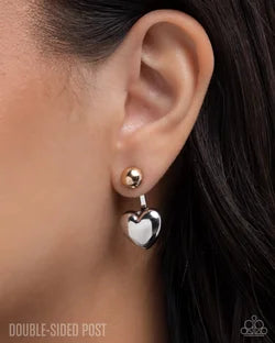 A glossy gold bead attaches to a double-sided post, designed to fasten behind the ear. Featuring a high sheen, a sleek silver heart peeks out beneath the ear for a romantic look. Earring attaches to a standard post fitting.