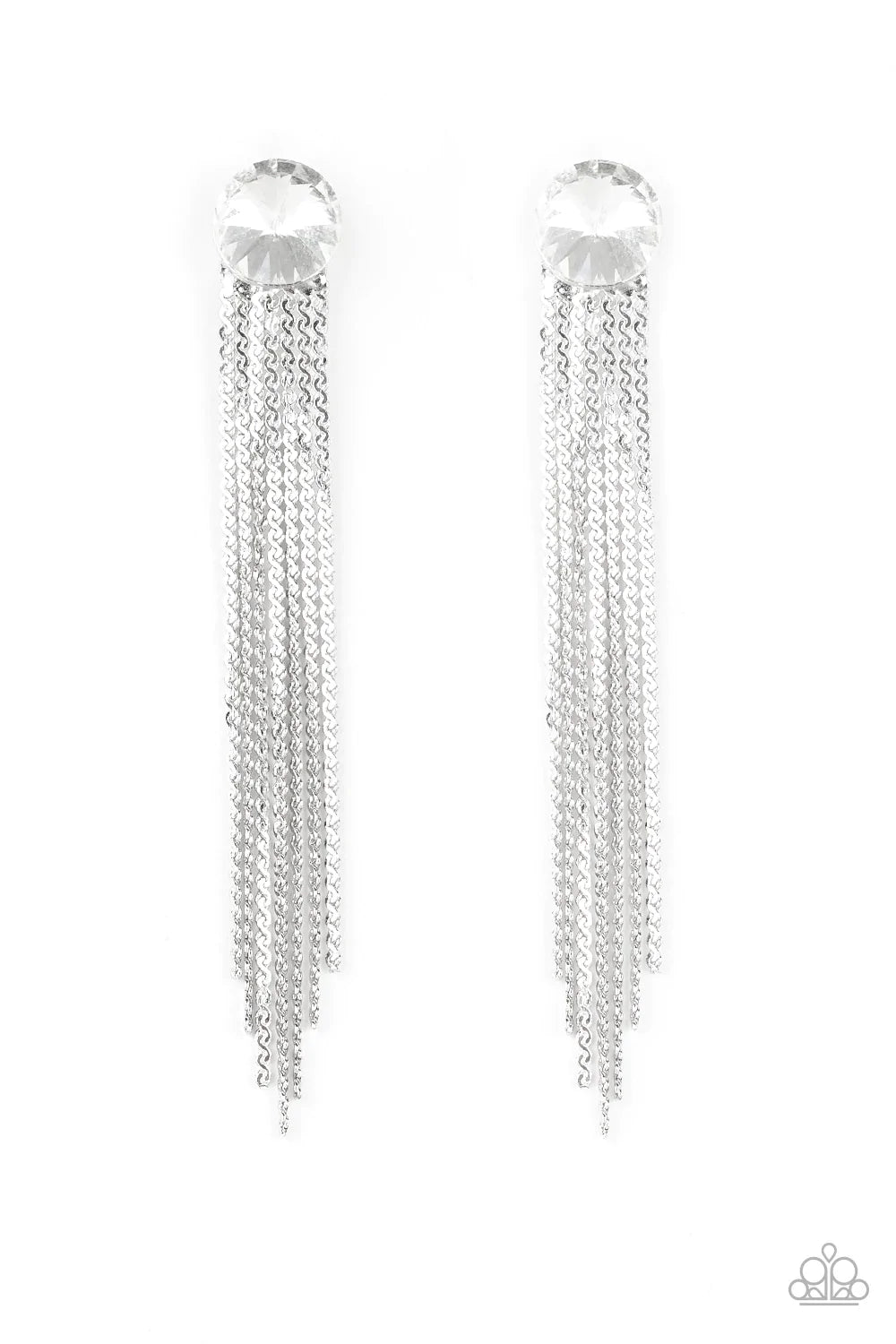 Flat silver chains stream from the bottom of a solitaire white gem, creating a dramatically tapered fringe. Earring attaches to a standard post fitting.