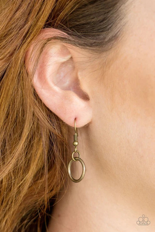 Brushed in an antiqued shimmer, brass rings link together below the collar, creating a bold interlocking pendant. Features an adjustable clasp closure.