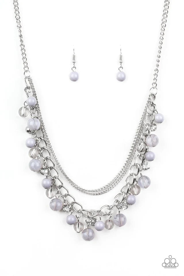 Infused with layers of mismatched silver chains, glassy, polished gray, and glittery white rhinestones swing from the bottom of a bold silver chain, creating a bubbly fringe below the collar. Features an adjustable clasp closure.