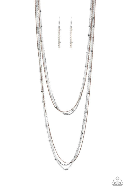 Mismatched silver chains and silver satellite chains layer down the chest. Brushed in an earthy brown finish, layers of ball-chain are added to the whimsical compilation for a colorful finish. Features an adjustable clasp closure.