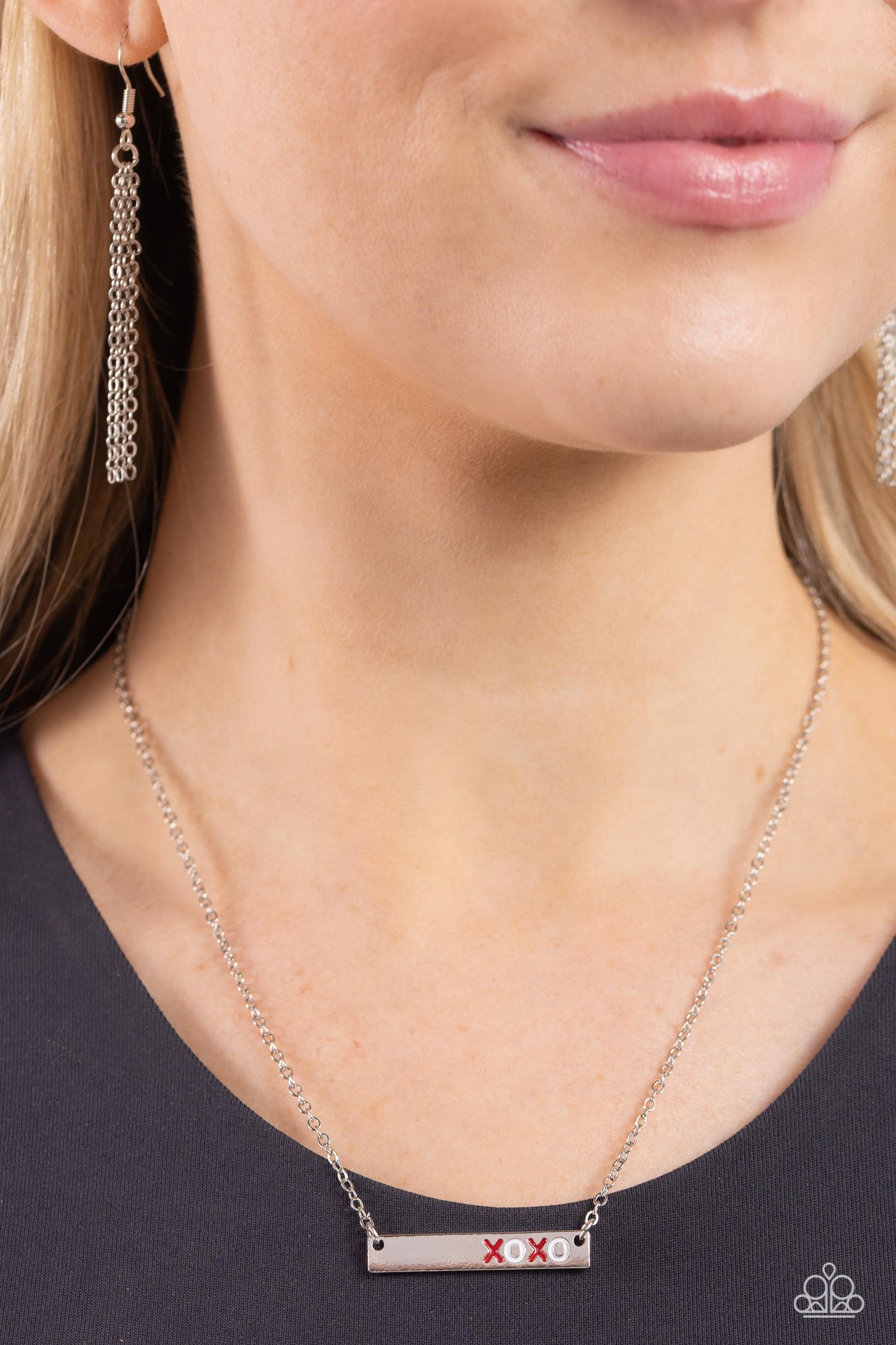 Featuring red and white paint, a dainty silver rectangular frame stamped with the letters, "XOXO" is suspended by a dainty silver chain below the collar for a valentines-inspired look. Features an adjustable clasp closure.